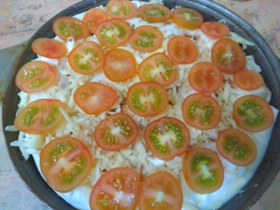 но можно и без них, посыпаем оставшимся сыром, заливаем молочно-яичной заливкой, ставим на 20 минут в духовку, 180градусов.