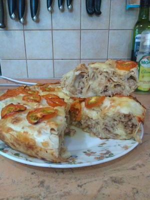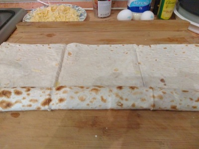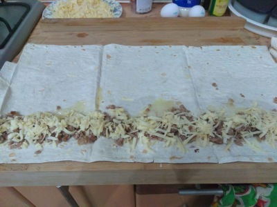 Я его выпекала в тефлоновой сковороде с ушками, диаметр примерно 20-22 см, сковороду смазываем маслом, но можно застелить и пекарской бумагой. По длинной стороне лаваша выкладываем часть фарша, сверху посыпаем сыром,