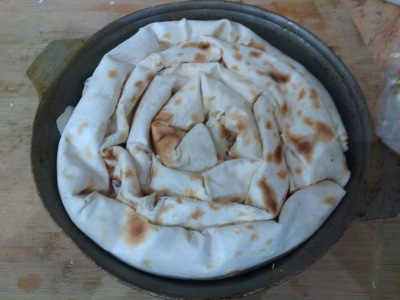 и выкладываем в форму. Остальные два лаваша также начиняем и продолжаем формировать улитку уже в форме. Если форма больше, стандартная разъёмная 28 см, то нужно взять четыре лаваша и увеличить количество начинки.