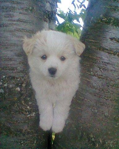 Однажды мы пошли в сад, где у нас растут черешня и груши. Я подошёл к дереву, чтобы полакомиться черешней. Умка побежал за мной, и тут я его сфотографировал: