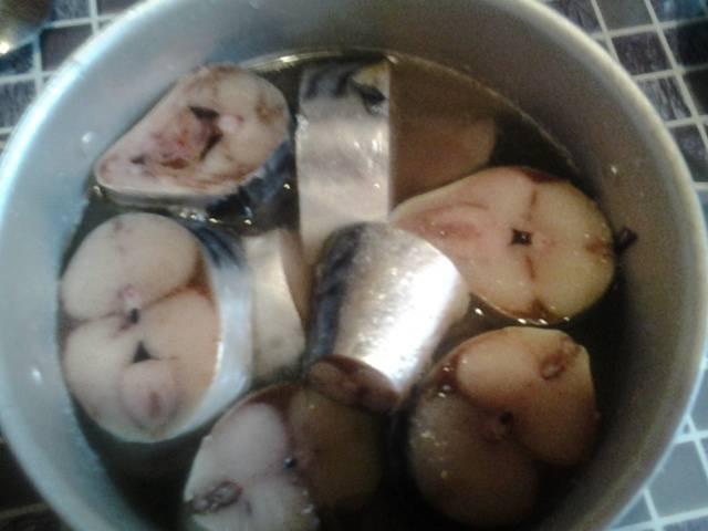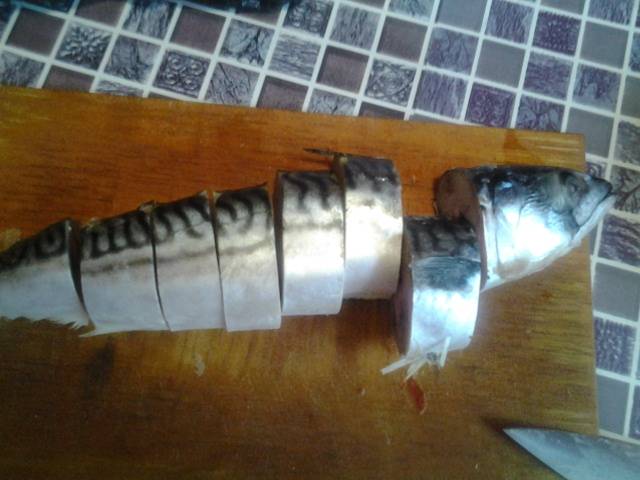 Невероятно вкусную рыбку я научу вас мариновать сегодня! Свежую или замороженную скумбрию режем произвольно, головы от тушек нам не понадобятся.