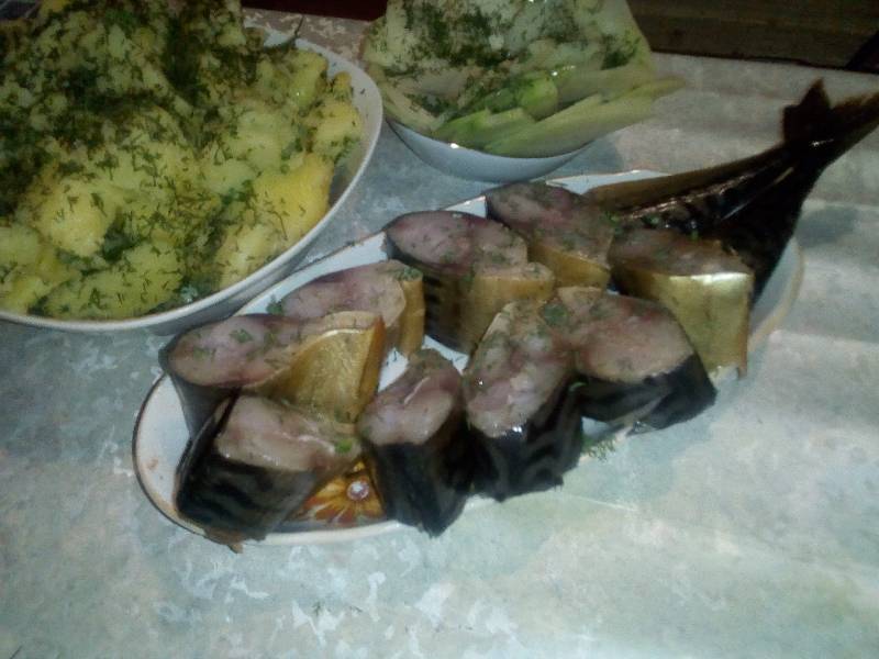 Подаём на стол с отварной картошечкой, любимой зеленью и свежей зелёной редькой или даже с редиской - она идеально подходит к скумбрии.