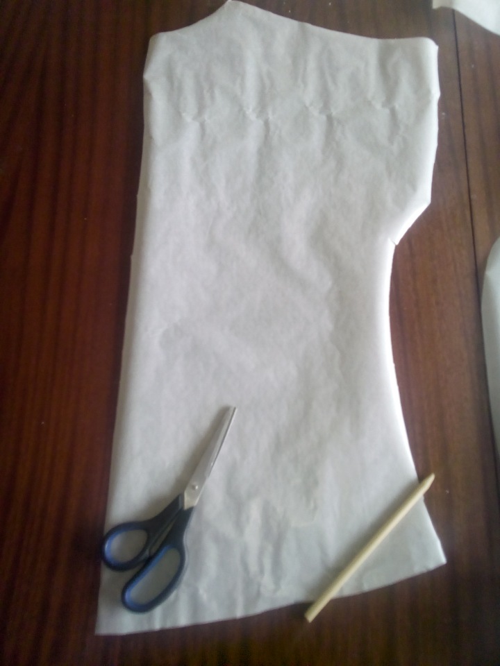 Складываю её вдоль пополам спинкой наружу, так как мне нужна пока только деталь спинки, накладываю на кальку, обвожу и вырезаю. Таких деталей я делаю две.