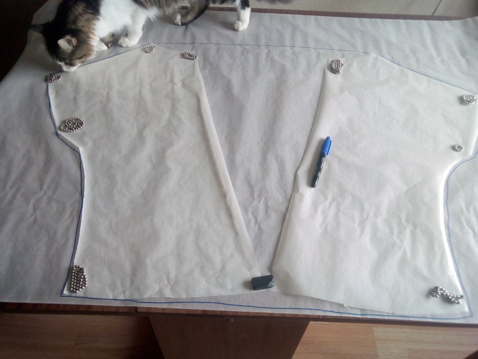 А вот теперь, используя две детали спинки конструируем деталь переда. Я хочу,чтобы у моей туники был вырез "качели". Поэтому детали спинки раскладываем на полотне кальки,как показано на фото.