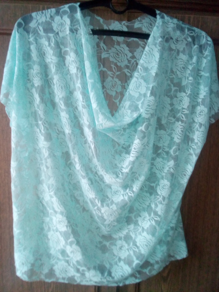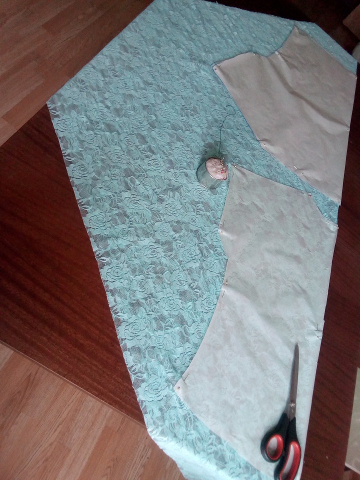 Итак, нам потребуется 1,5 м ткани при такой же ширине, лёгкой, струящейся, на ваше усмотрение цвет и текстура. У меня бирюзовый стрейч-гипюр. Ножницы, фломастер или маркер, бумага для выкройки, швейная машина, ну и, конечно, ваше желание.