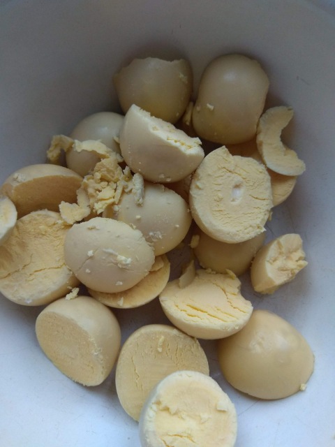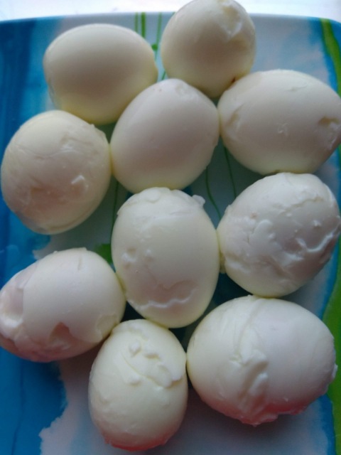 (Лучше было бы, если свежие яйца будут храниться в холодильнике некоторое время, чтоб после чистки скорлупы они были ровными.)