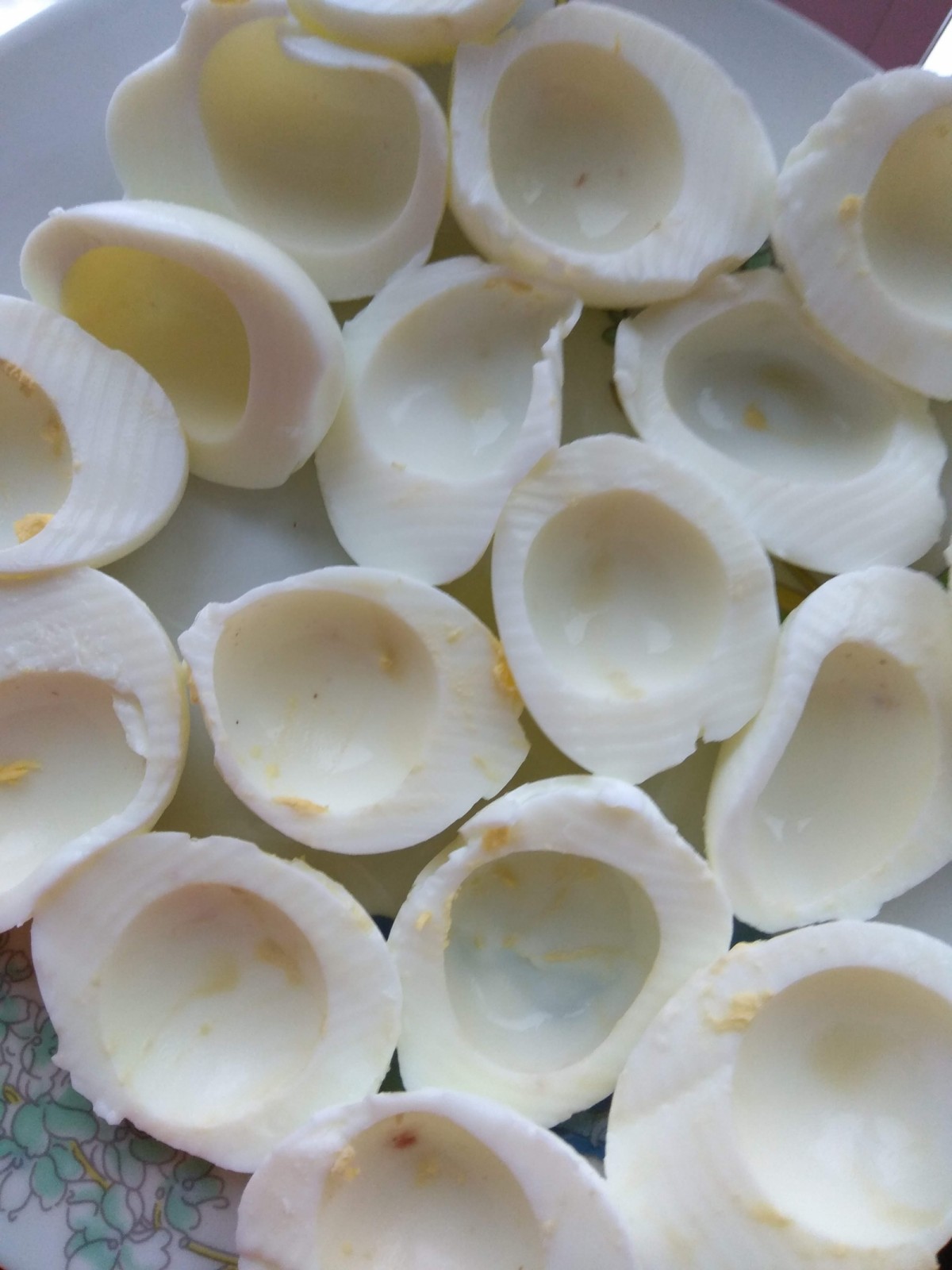 Теперь можно разрезать пополам вдоль и достать желток, который нужно выложить в отдельную глубокую тарелку.
