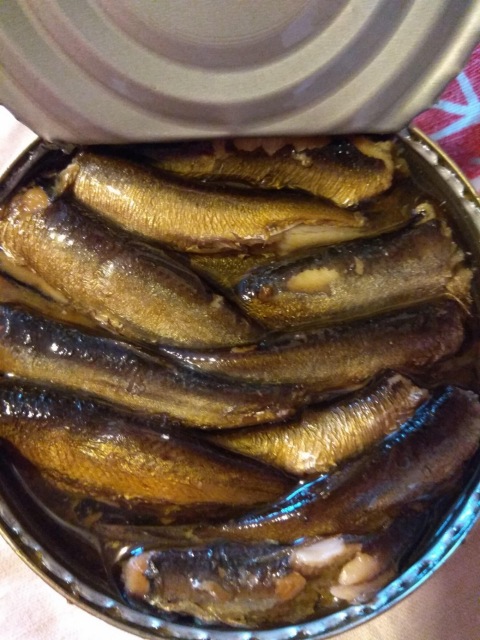Открыть банку шпрот и слить с них масло (можно и не сливать, на самом деле некоторым так кажется вкуснее, сытнее и не сухо). Аккуратно убрать у каждой рыбки плавники и хвост.