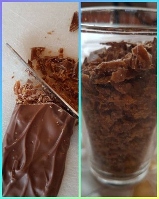 Раскрошить шоколад с карамелью (обычным ножом) на мелкие кусочки. Убрать туда же, в холодильник.