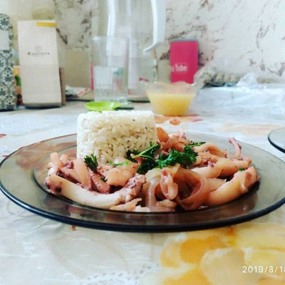 Угощайтесь! Кальмар с бурым рисом 🍚. Минимум времени и максимум вкуса 😋 Рис отвариваем, а кальмара обжариваем с луком в пропорции 1:1. Украшаем и подаём