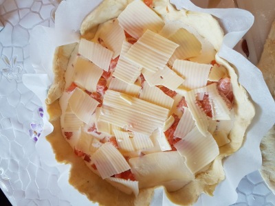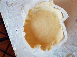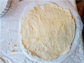 Берём большую часть и прямо на бумаге, вырезанной по размеру круглой формы (включая края) раскатыааем большую часть теста. Не забываем, про бортики (несколько сантиметров высоты).