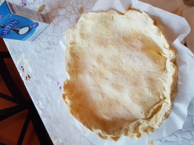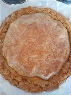 Раскатываем вторую часть теста на доске и закрываем пай сверху. Защипываем края.