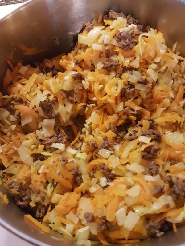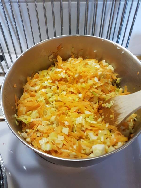 3. Смешиваем капусту и морковь, добавляем немного соевого соуса, растительного масла, и тушим на сковородке под крышкой на маленьком огне. Не забываем помешивать.