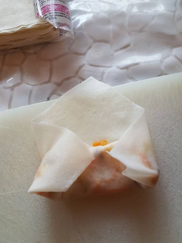 Осторожно отделяем один лист рисовой бумаги (они очень тонкие ) и кладём на доску углом к себе. Сверху выкладывем немного начинки и начинаем заворачивать от угла к углу как на фото.