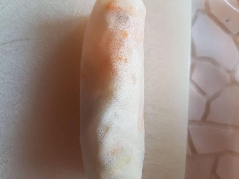Рисовую бумагу вытаскиваем из морозилки накануне, чтобы она спокойно разморозилась в холодильнике. Начинку тоже лучше сделать накануне и убрать в холодильник на ночь. Тогда она будет легче заворачиваться и бумага не порвётся.