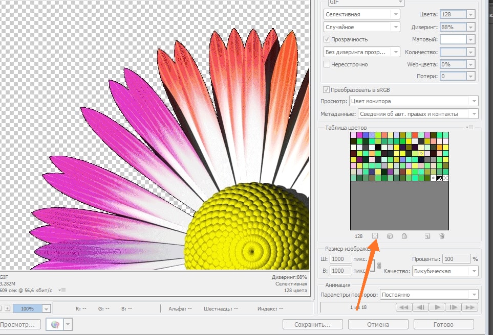 Открываем программу Adobe PhotoShop, Файл - Открыть. Как только файл открылся, нажимаем комбинацию клавиш Alt+Ctrl+Shift+S либо на верхней панели инструментов выбираем Файл - Сохранить для Web. Открывается уже знакомое окошко сохранения с различными параметрами. Нам необходимо кликнуть на фон, который мы хотим убрать с нашей гиф. Справа в таблице цветов увидим выделенный последний квадратик - цвет нашего фона