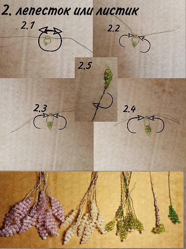 Для лепестка или листика продеваем проволоку в одну бусину, потом крест на крест - ещё в две. Потом, так же крест на крест в три.