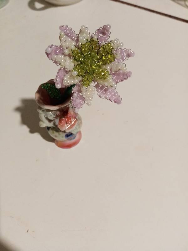 Для третьего - 9 - 1-2-3-4-5-4-3-2-1 бусин. Самые маленькие лепестки должны быть одного цвета с сердцевинкой. Второй и третий ряд могут быть любыми, по желанию. Для каждого ряда надо по 8 лепестков. Так же делаем несколько зелёных листиков.