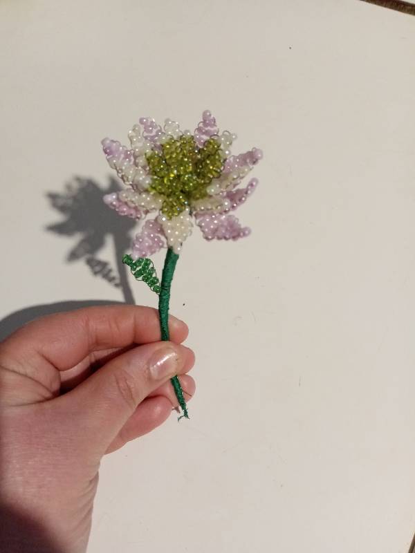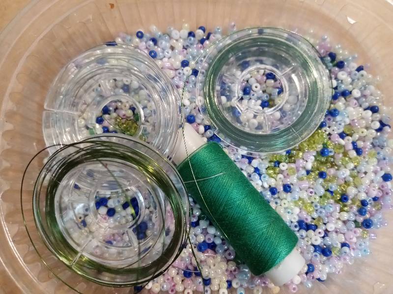 Для работы нам понадобится тонкая проволока (достаточно тонкая, чтобы можно было нанизать бисер, но достаточно твёрдая, чтобы не прогибалась под весом бисера), зелёные нитки и 2-4 цвета бисера - зелёный для листиков, жёлтый или желто-зеленый для сердцевинки, и 1-2 цвета для лепестков (у меня это жёлто-зелёный для сердцевинки, белый для первого ряда лепестков и розовый - для второго).