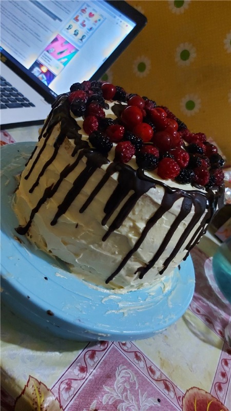 8. Затем достать крем, и обмазать коржи ( по желанию можно украсить орешками и ягодами).