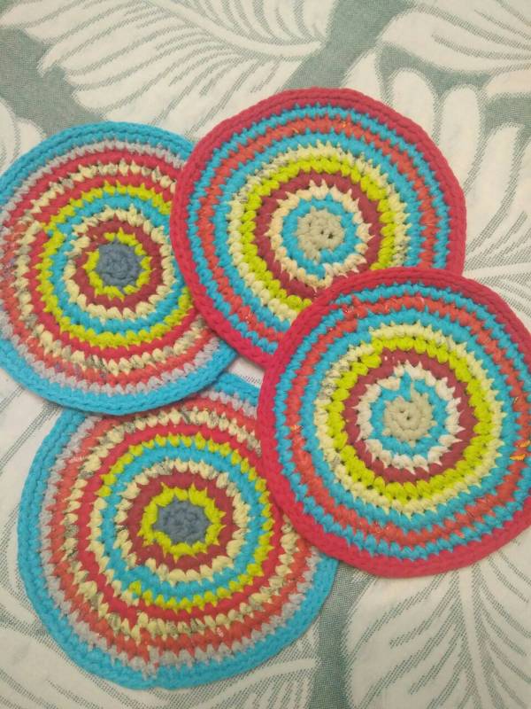 По окончании работы, заправьте нить и отпарьте изделия утюгом. Мои кружочки получились приблизительным диаметром 14 см. Их можно использовать как прихватки или подставки под горячую посуду.