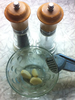 Почистите чеснок и выдавите прессом для чеснока в пиалку, туда же добавьте соль и черный перец. Перемешайте эту смесь и обмажьте ею курочку снаружи и внутри.
