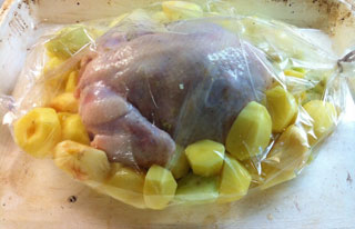 В рукав положите курочку и по краям разместите яблочки и картошку. Завяжите крепко рукав по краям.