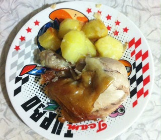 По готовности рукав разрежьте сверху, разделайте курицу и разложите по тарелочкам.