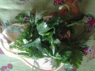 Моем и нарезаем зелень. Я брала лук зеленый, чуть укропа, чуть больше петрушки и листья сельдерея.
