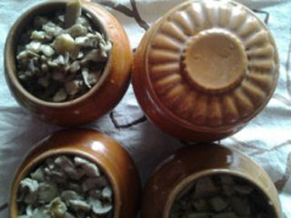 Дальше выкладываем всё в горшочки. На дно картошку нарезанную, солим, сверху добавляем зелень и жареные грибы. Еще чуть солим по вкусу. Капаем масло растительное и добавляем воду.