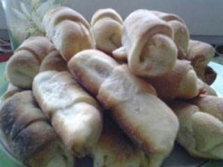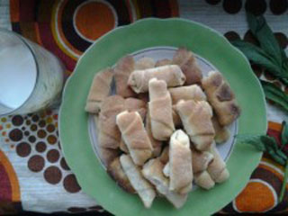 Для начинки я покупаю джем густой или сгущенку варёную "Ириску". В эти части помещаем начинку и закручиваем. По форме булочка получается, как пальчик.