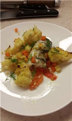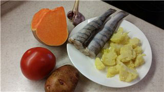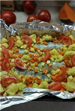 Укладываем в форму для запекания рыбу, цветную капусту, нарезанную кубиками картошку, нарезанную кубиками тыкву.