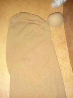 Скатываем из наполнителя небольшой шарик и засовываем его в уголок носка,сжимаем и обматываем нитками белого цвета.