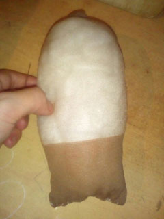 Наполнитель разбираем на мелкие кусочки и набиваем носок.