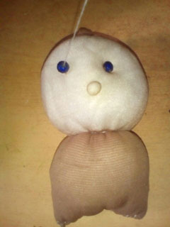 Придаем пупсу форму, там где резинка посередине – в шов втыкаем иголку и вытягиваем ее в месте разделения головы и туловища,затем обратно возвращаем иголку в шов.