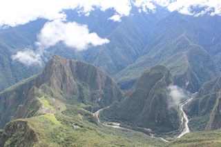 Дорога от Ойантаитамбо до Мачу-Пикчу занимает примерно 2,5 часа. Поезда с вагончиками со стеклянной крышей неторопливо пробираются по одноколейной железной дороге между живописных скал, сквозь прорубленные в камне туннели, вдоль бурлящей горной реки до железнодорожной станции Агуас-Кальентес, откуда до города инков по извилистому серпантину ходят автобусы. Дорога составляет около 8 км и те туристы, которые приезжают в Мачу-Пикчу на более продолжительное время и не должны успеть днем на обратный поезд, преодолевают этот путь пешком, наслаждаясь захватывающими видами Анд. Билеты на Мачу-Пикчу следует покупать заранее в интернете, так как в сутки туда пускают только 2500 человек и в день намеченного визита, как правило, в кассах уже не бывает входных билетов. Кроме билета в основной «городской» комплекс я приобрела также билет на подъем на гору Мачу-Пикчку (исп. Montaña Machu Picchu) на высоту 3 110 метров над уровнем моря, откуда открывается умопомрачительный вид на всю долину. С горой правила еще строже – в день по крутой, выложенной камнями разного размера лестнице на нее могут подняться 400 человек, которых запускают на подъем утром двумя группами с перерывом в час. Такие ограничения были сделаны несколько лет назад по рекомендации ЮНЕСКО для того, чтобы сохранить Мачу-Пикчу от разрушения. Подъем на гору занял у меня примерно 50 минут, и, признаюсь честно, это было невероятно тяжело. Нехватка кислорода на высоте, достаточно высокая влажность, солнце, балласт в виде запаса воды и других личных вещей в рюкзаке за спиной, да и сама тропа очень быстро отбирают силы даже у неплохо тренированного человека. После 25 минут подъема, испытывая изнеможение, ты начинаешь искать поддержку у идущих тебе навстречу уже спускающихся туристов и невольно задаешь им немой вопрос «я уже близко?». Видя эту застывшую в глазах фразу, они подбадривают тебя, говоря, что осталось чуть-чуть, всего 5 минут. За последние 25 минут восхождения я 5 раз слышала это и вместе с силами меня также покидала и надежда добраться до вершины. Пятые «еще 5 минут» оказались действительно последними и, оказавшись на самой вершине, пытаясь восстановить дыхание после физической нагрузки, я все равно не могла дышать, так как теперь дыхание вместе с духом перехватывало от неземной красоты и восхищения.