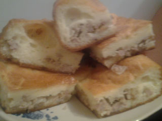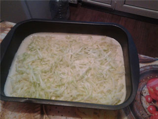 Затем высыпаем и распределяем равномерно начинку. Это может быть что угодно. Лично мои наблюдения: лучше всего подходят отварные яйца с зеленым луком, жареная капустка, свежие кабачки на терку, жареные грибочки, обжаренный с лучком фарш, картошка-пюре с сыром, тертые яблоки с корицей, половинки абрикосов. В общем, любая несладкая начинка. Сегодня у меня кабачки и мясной фарш.
