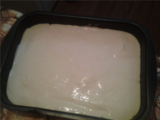 Взбиваем венчиком яйца со сметаной, майонезом, солью и содой, потом подмешиваем муку. Если тесто получилось слишком густым, разбавляем его небольшим количеством кефира. По консистенции тесто должно быть похоже на магазинную сметану, которая легко стекает с ложки. Выливаем половину теста в глубокую форму.