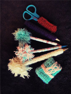 По желанию вы можете украшать другую канцелярию. Придумать свой стиль и узор, можете дополнить кончик карандаша ярким помпоном. А ещё вы можете сделать гораздо больше милых украшений на ваши письменные принадлежности. Я, например, сделала чехол на мои ножницы, дополнила карандаши милыми пушистыми помпонами. Вот что у меня получилось.