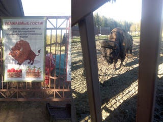 Питаются зубры сырой морковкой и яблоками, также любят и свёклу. Каждый свободно может подойти к ограждению и покормить зубров с рук. Да-да, и не надо бояться, они абсолютно не кусаются.