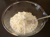 Для начала выложим творог в миску и хорошенько разомнем вилкой.