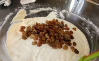 Теперь настал черед добавок. У меня размоченный в теплой воде изюм. Можно выбрать добавку на свой вкус: лимонную цедру, корицу, цукаты, мелко порезанные фрукты (но только не всё сразу!). А можно вообще ничего не добавлять